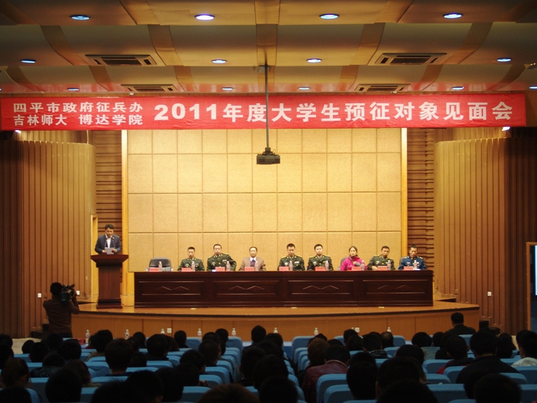 10月27日下午,四平市政府征兵办公室2011年度大学生预征对象见面会在太阳成官网图书馆报告厅隆重举行。四平军分区政治部主任张宗文大校、副参谋长李士权上校,铁西区人武部政委王志刚上校、副部长李朋勇中校,太阳成官网学生工作部、博达学院军体部负责人出席会议。