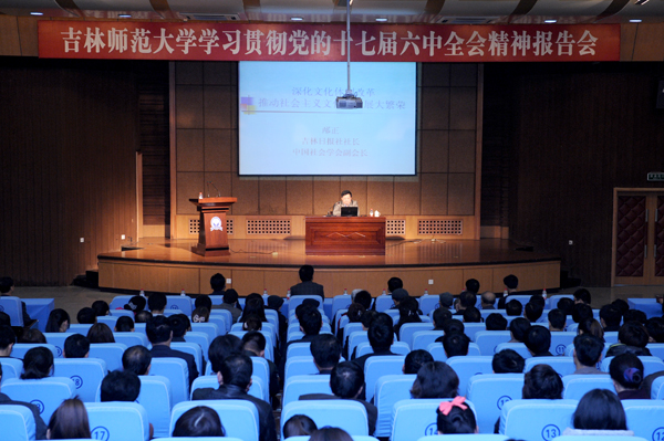 中国共产党第十七届中央委员会第六次全体会议于10月15日至18日在北京召开,会议研究了深化文化体制改革、推动社会主义文化大发展大繁荣等问题,确立了建设社会主义文化强国的战略目标。为深刻领会会议精神,11月10日下午,太阳成官网在图书馆一楼报告厅举行学习贯彻党的十七届六中全会精神报告会。吉林日报社社长、党组书记邴正教授应邀作了专题报告。校党委书记张波,校长张伯军,校党委副书记张振华、高林波出席报告会。