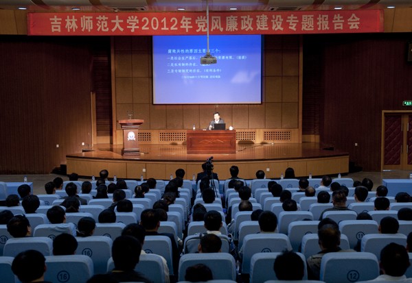 为进一步加强党风廉政教育,帮助广大党员干部筑牢反腐倡廉的思想道德防线,按照学校党委今年的工作部署,9月12日下午,学校在图书馆报告厅召开“2012年党风廉政建设专题报告会”,邀请中共四平市委常委、市纪委书记邱成作《廉洁自律 远离腐败》的专题报告。中共四平市纪委副书记史奎春、市纪委常委周冠忠,学校党委书记张波,校长张伯军,校党委副书记张振华,副校长齐奎、张勇,校纪委书记王亮出席报告会。学校副科级以上干部、辅导员以及部分学生干部代表共370人聆听了报告。