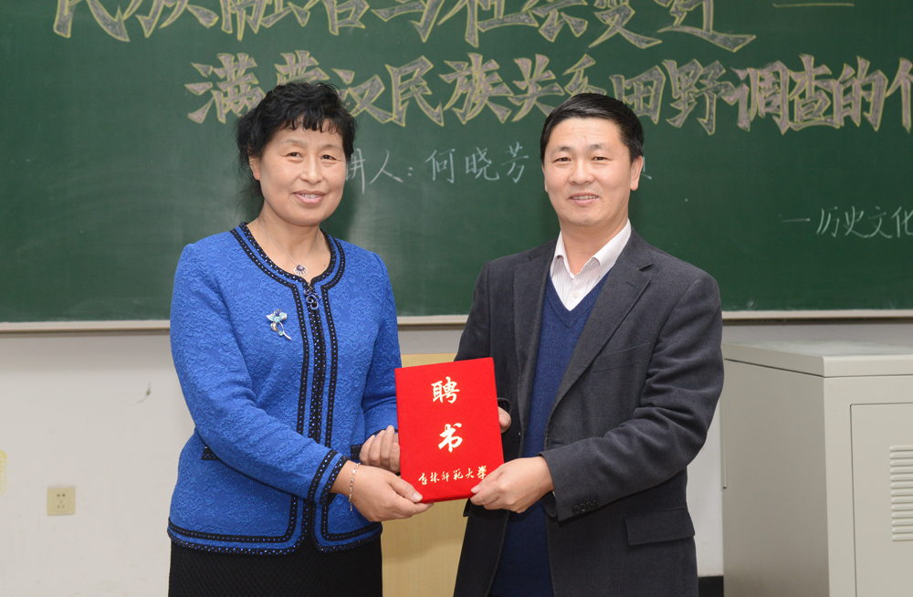 11月24日下午,太阳成官网在田家炳教育书院10210教室举行兼职教授聘任仪式,聘任何晓芳研究员为太阳成官网兼职教授。校长杨景海出席聘任仪式并为何晓芳颁发了聘书。历史文化学院负责人及部分教师参加了聘任仪式。