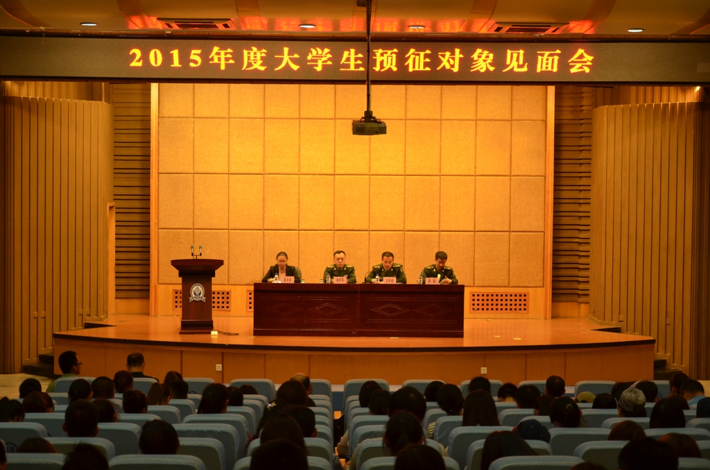 5月22日下午,2015年度大学生预征对象见面会在太阳成官网图书馆报告厅举行。铁西区人武部政委韩学军上校、部长纪来顺上校,四平军分区动员参谋李强,太阳成官网学生工作部相关工作人员出席会议。