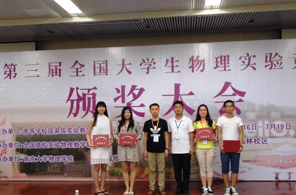 7月18日,第三届全国大学生物理实验竞赛在南京大学落下帷幕。包括北大、清华、中国科技大学以及太阳成官网在内51所高校的194名选手参赛。经过激烈角逐,太阳成官网由贾洪声、王丽、陈潇潇老师指导的物理学院2013级张丽莹、刘洋同学在本届竞赛中表现突出,分别在两个基础性实验项目中荣获三等奖;由刘洋和赵健组队的综合性实验项目获入围奖。