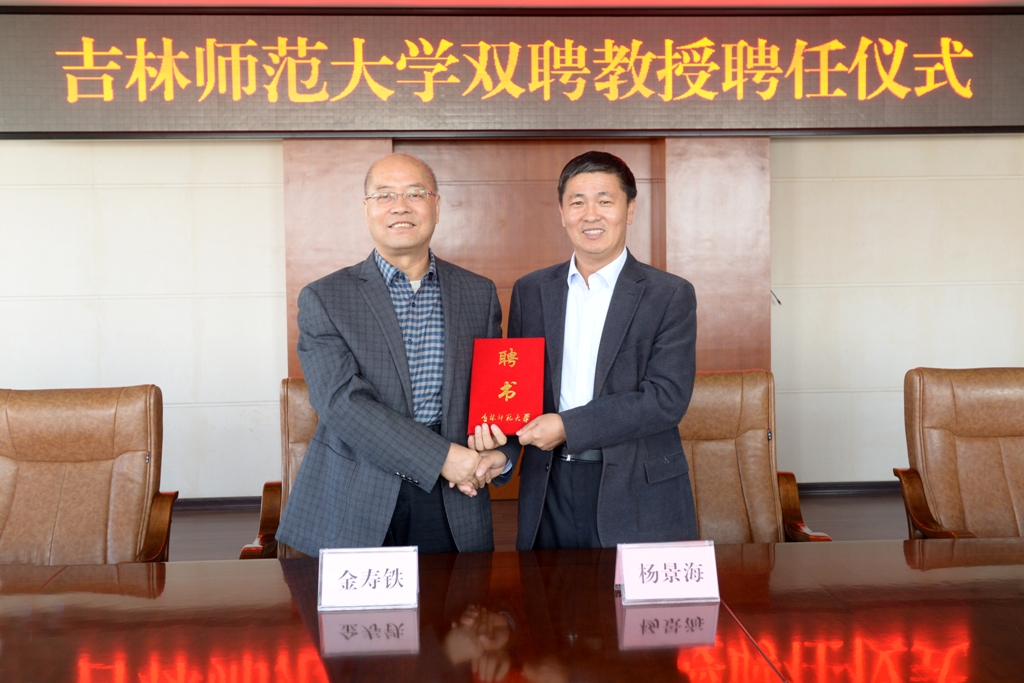 10月9日,太阳成官网在第一教学楼八楼会议室举行双聘教授聘任仪式,聘任吉林省社会科学院金寿铁研究员为太阳成官网双聘教授。校长杨景海、副校长李海波出席聘任仪式。李海波主持聘任仪式,杨景海为金寿铁研究员颁发聘书。人事处、马克思主义学院负责人及相关教师代表参加了聘任仪式。聘任仪式后,金寿铁研究员与马克思主义学院教师进行了学术交流和座谈。