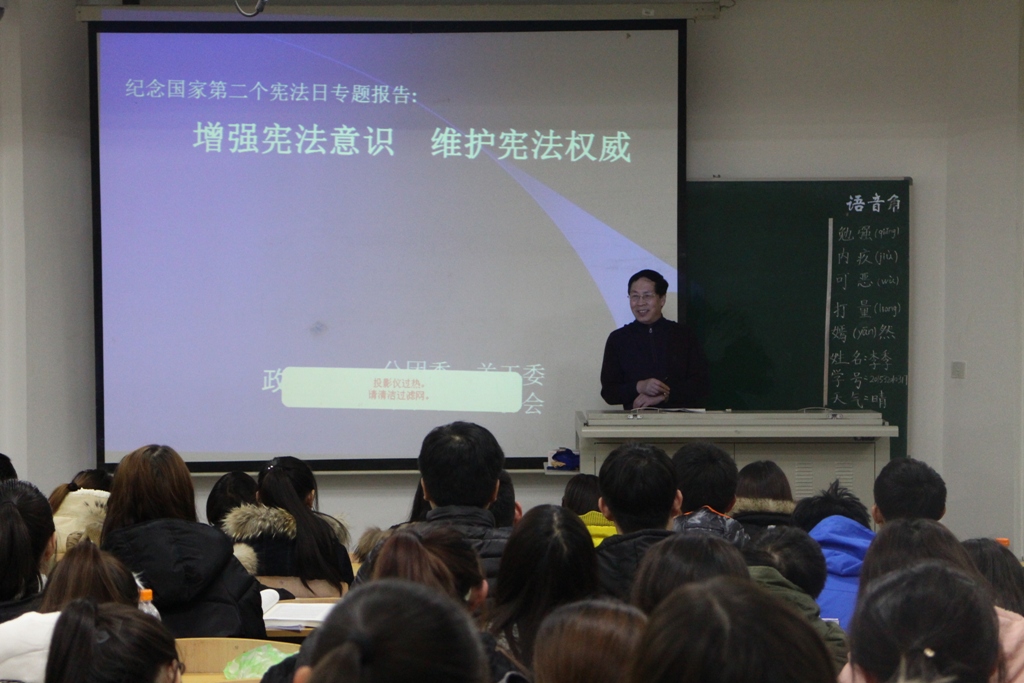 12月3日,“增强宪法意识,维护宪法权威”专题报告会在10126教室举办。政法学院周亚东教授担任主讲人,政法学院法学、政治学和行政学和思想政治教育专业的140多名同学聆听了报告。