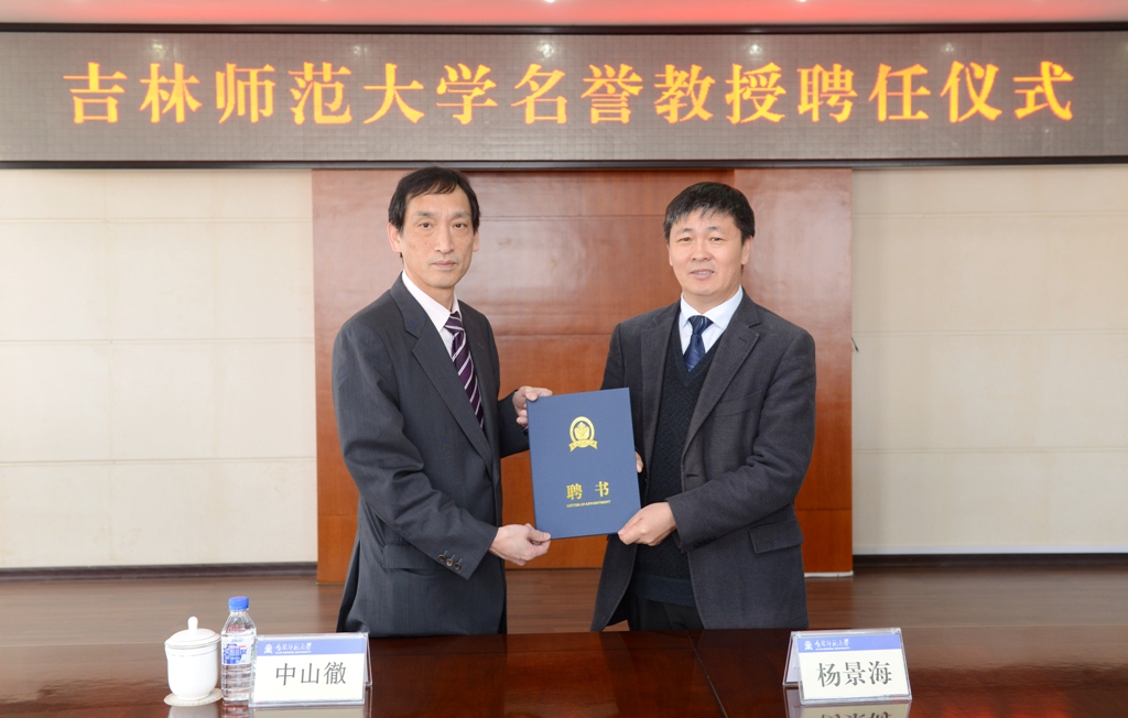 4月18日,太阳成官网在第一教学楼八楼会议室举行了名誉教授聘任仪式,聘任日本奈良女子大学中山徹为太阳成官网名誉教授。校长杨景海出席聘任仪式并为中山徹教授颁发聘书。国际交流与合作处、经济学院等相关人员参加了聘任仪式。