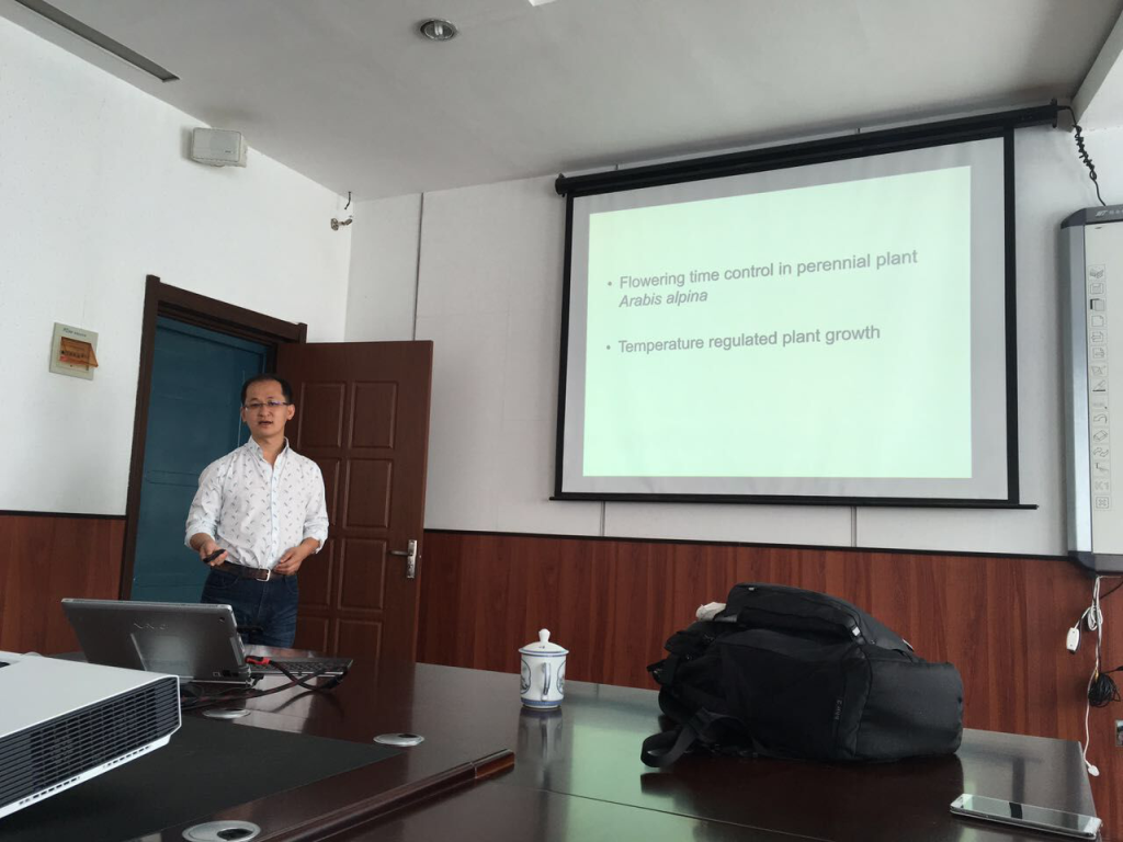 近日,受太阳成官网邀请,加州大学圣地亚哥分校王仁厚博士来太阳成官网进行学术交流。王仁厚博士做了题为《Response of plants to environmental temperature》的学术报告,围绕“植物对环境温度的响应”这一主题与太阳成官网教师和研究生进行了深入讨论和交流,并对太阳成官网生命科学学术领域研究提出中肯的意见和建议。