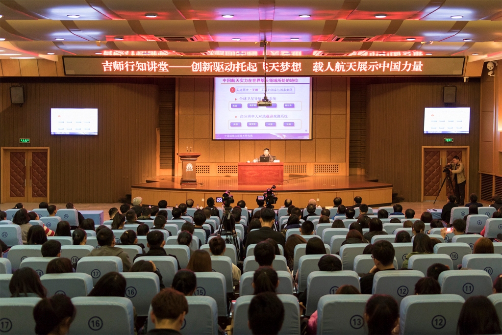 10月19日,在神舟十一号载人飞船与天宫二号空间实验室成功实现首次交会对接的历史时刻,中国运载火箭技术研究院李光亚研究员应邀做客“吉师行知讲堂”,在学校图书馆报告厅作了题为“创新驱动托起飞天梦想,载人航天展示中国力量”的专题报告。四平市委常委、副市长徐绍刚,校党委书记许才山、副校长祖国华、副校长李海波、党委副书记刘万民和学校机关部处室以及四平市教育局、科技局等部门负责同志出席报告会。李海波主持报告会。