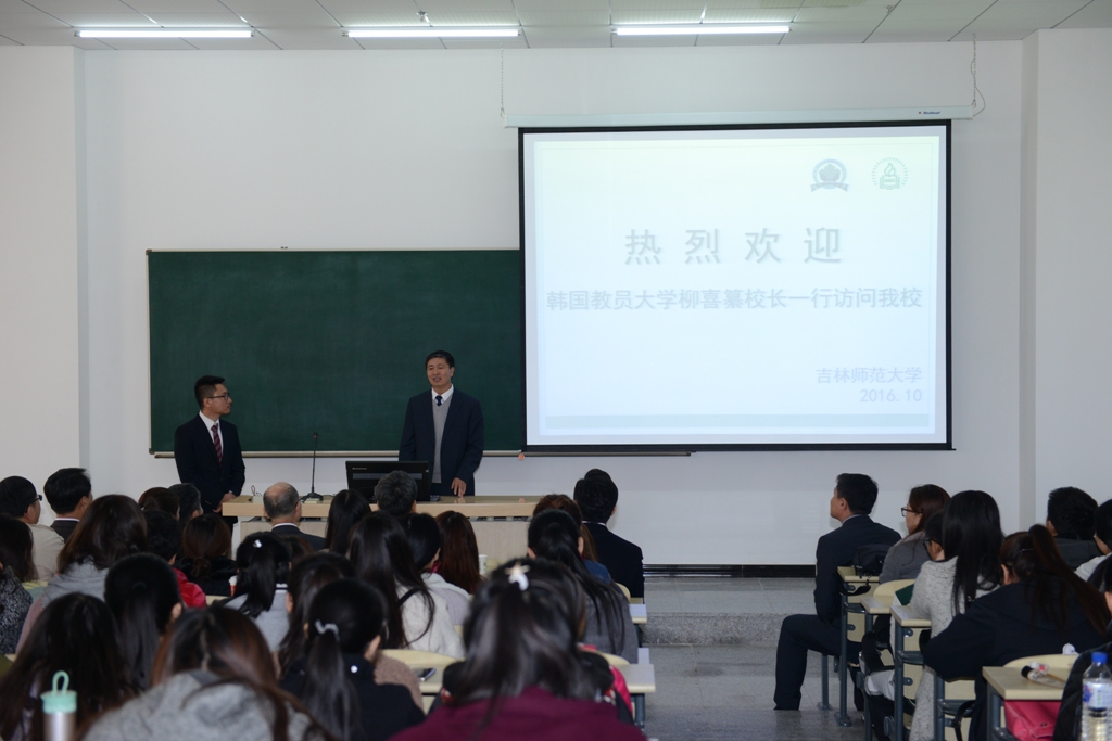 会谈结束后,柳喜纂一行在杨景海陪同下,与中韩合作办学学前教育专业全体师生举行了见面会。柳喜纂向同学们介绍了韩国教员大学概况,并表示欢迎各位同学到韩国留学深造。杨景海对同学们提出了殷切期望和严格要求,鼓励大家把握机会,通过自身努力成为通晓中、韩、英三语,掌握学前教育专业知识的国际化复合型人才。