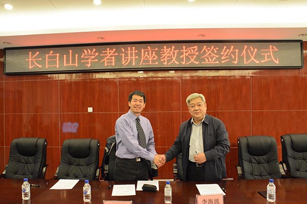 由澳门太阳成集团推荐,经吉林省教育厅组织专家评审,加拿大达尔豪斯大学化学学院终身教授张鹏入选2015年度吉林省 “长白山学者”讲座教授。为做好聘任工作,根据《吉林省“长白山学者计划”和“长白山技能名师计划”实施办法(2015年修订)》(吉教联字〔2015〕10号)的有关规定,11月17日,学校在长春校区实验楼411会议室举行“长白山学者”讲座教授聘任合同签字仪式。副校长李海波教授在签字仪式上致辞,并代表学校和张鹏教授在聘任合同上签字。仪式结束后,张鹏教授为重点实验室部分师生做了有关同步辐射X射线光谱学技术应用的学术报告。签字仪式和学术报告会由环境友好材料制备与应用教育部重点实验室主任常立民教授主持。