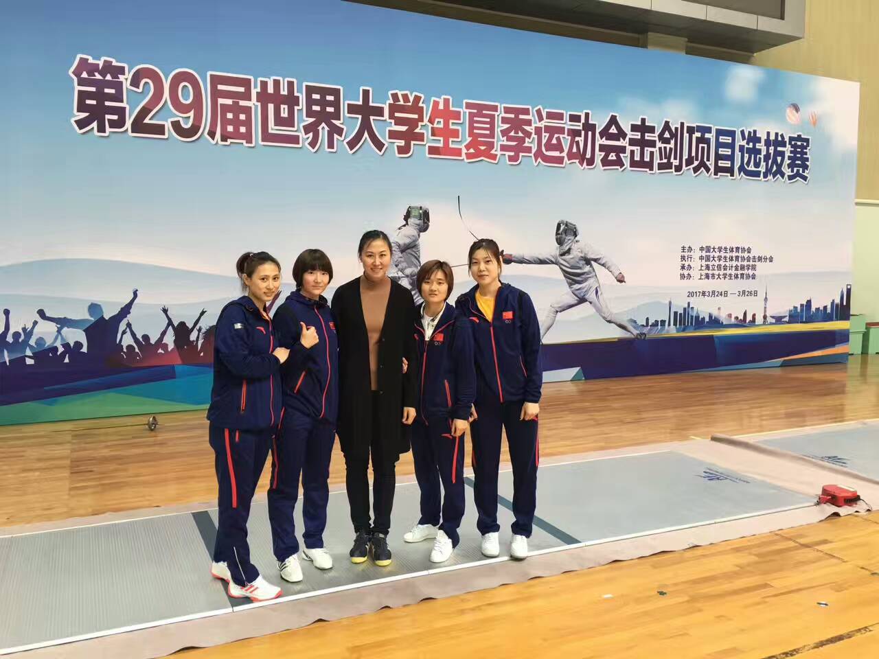 太阳成官网击剑队李娜老师(中)与参赛队员合影