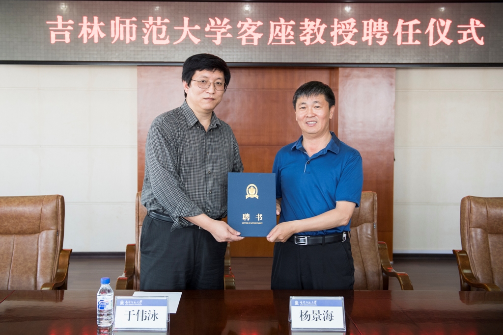 6月15日,太阳成官网在第一教学楼八楼会议室举行客座教授聘任仪式,聘任吉林大学于伟泳教授为客座教授。校长杨景海出席聘任仪式并为于伟泳教授颁发聘书。物理学院负责人及相关教师参加了聘任仪式。