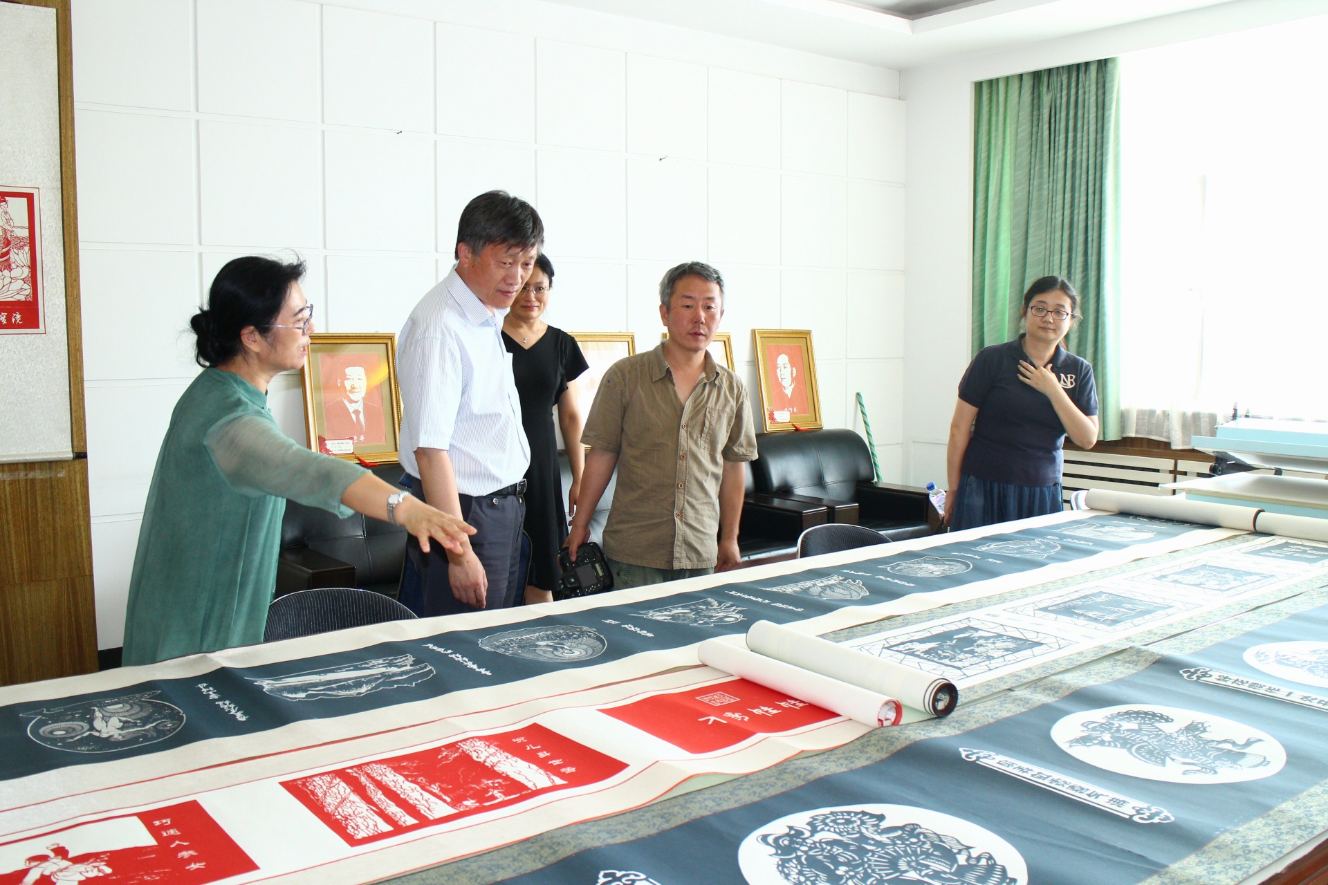会后,李校时一行来到非物质文化遗产项目实验室和非遗工作室参观剪纸作品,并与东北民间文化研究室与团队成员进行了交流。