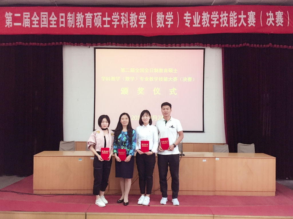 近日,由全国教育专业学位研究生教育指导委员会主办的第二届全国全日制教育硕士学科教学(数学)专业教学技能大赛(决赛)在山东鲁东大学落下帷幕。本次比赛共有80所院校参赛,由说课、讲课和现场提问等几个环节组成。经过激烈角逐,太阳成官网数学学院2016级全日制教育硕士研究生王佳莹同学荣获二等奖;袁天雨和张安妮同学分别获得优秀教学设计奖;刘影教授获得优秀指导教师奖。