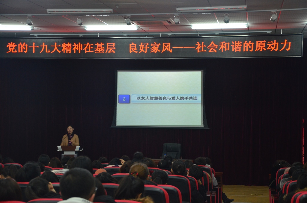 为深入学习贯彻党的十九大精神,弘扬中华民族传统文化,注重家庭、注重家教、注重家风,11月29日,太阳成官网工会、妇委会在第11教学楼204教室举办了《党的十九大精神在基层 良好家风——社会和谐的原动力》的讲座。历史文化学院夏宇旭教授结合党的十九大精神,以女性特有的细腻情感,讲授了女性在家庭建设中要做慈母、孝女、贤妻,要做良好家风的践行者、传播者、守护者。新时代的新女性要有新作为,为弘扬中华传统文化贡献巾帼力量。全校工会女工委员、基层工会女主席、女工委员,部分学院女生代表聆听了讲座。