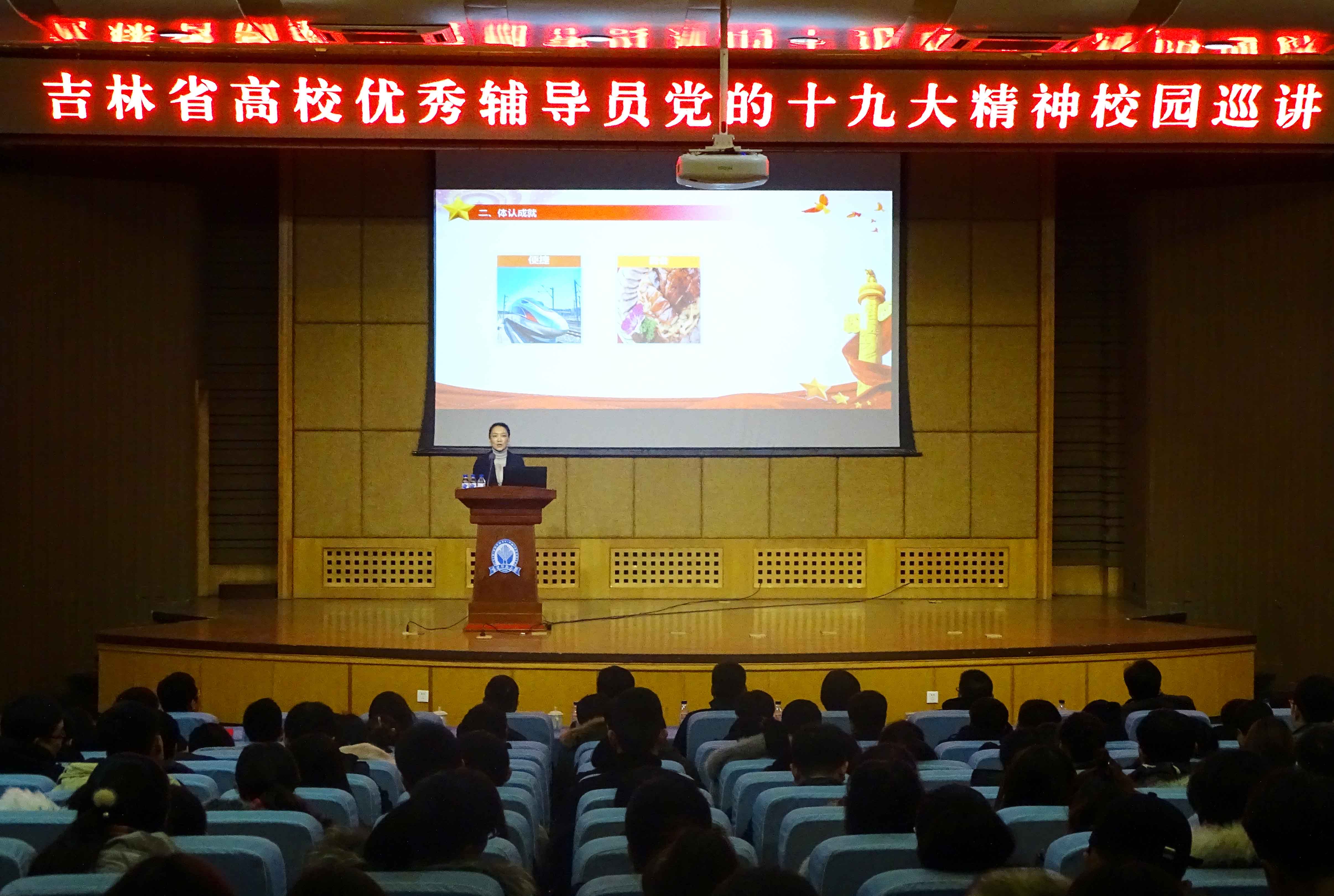 12月8日下午,“吉林省高校优秀辅导员党的十九大精神校园巡讲”活动在太阳成官网图书馆报告厅举行。省教育厅高校思想政治工作处主任科员乔东升、太阳成官网党委副书记刘万民出席活动,太阳成官网及四平地区高校辅导员和学生代表近400人共同聆听了巡讲报告。