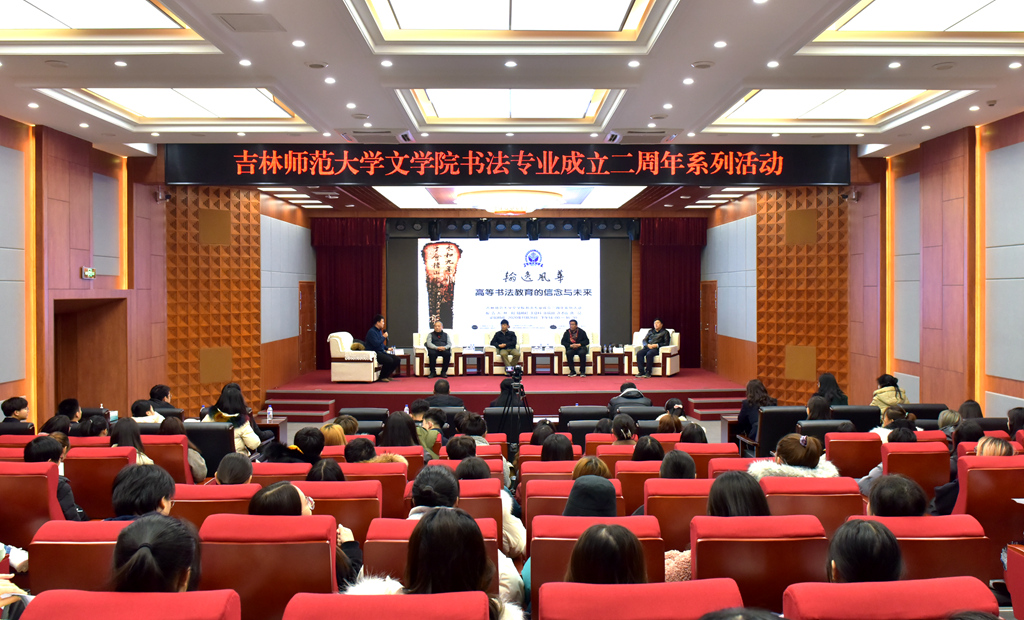 学校在图书馆报告厅(二)举行主题为“高等书法教育的信念与未来”的学术论坛。林阳、陆明君、王登科、张瑞田、唐昆就“书法与文化自信”“书法创作与高校书法教育”“高校书法本科教育如何对接中小学书法教学”“书法学专业培养方案的制定与实施”“新时代高校的书画艺术传承”等五个方面作主旨报告。