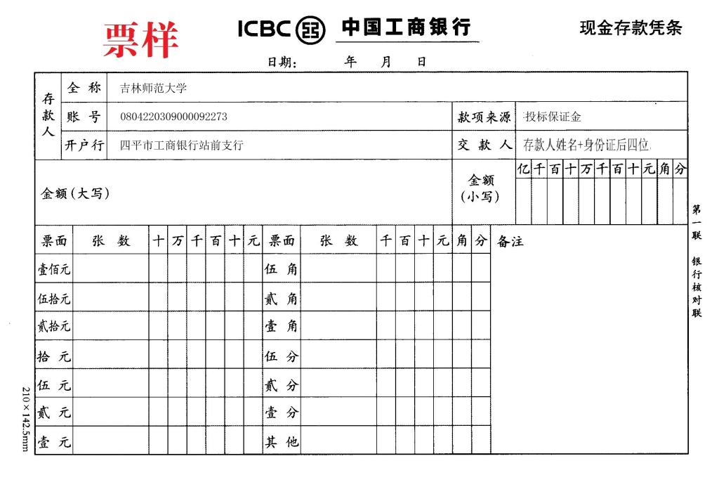 2.凡确定参加投标者,在网上报名成功后,须于2017年7月27日(周四)下午16:00前,将相应的投标保证金(第一食堂超市保证金5万元,第三食堂超市保证金5万元,第四食堂超市保证金3万元)通过工商银行营业网点存入如下账户,过期不候,责任自负。户名:澳门太阳成集团,开户行:四平市工商银行站前支行,账号:0804220309000092273,备注:存款人姓名+身份证后四位。存款单回执应于2017年7月28日开标截止时间前当场提交。存款单填写样例见本公告附件2。