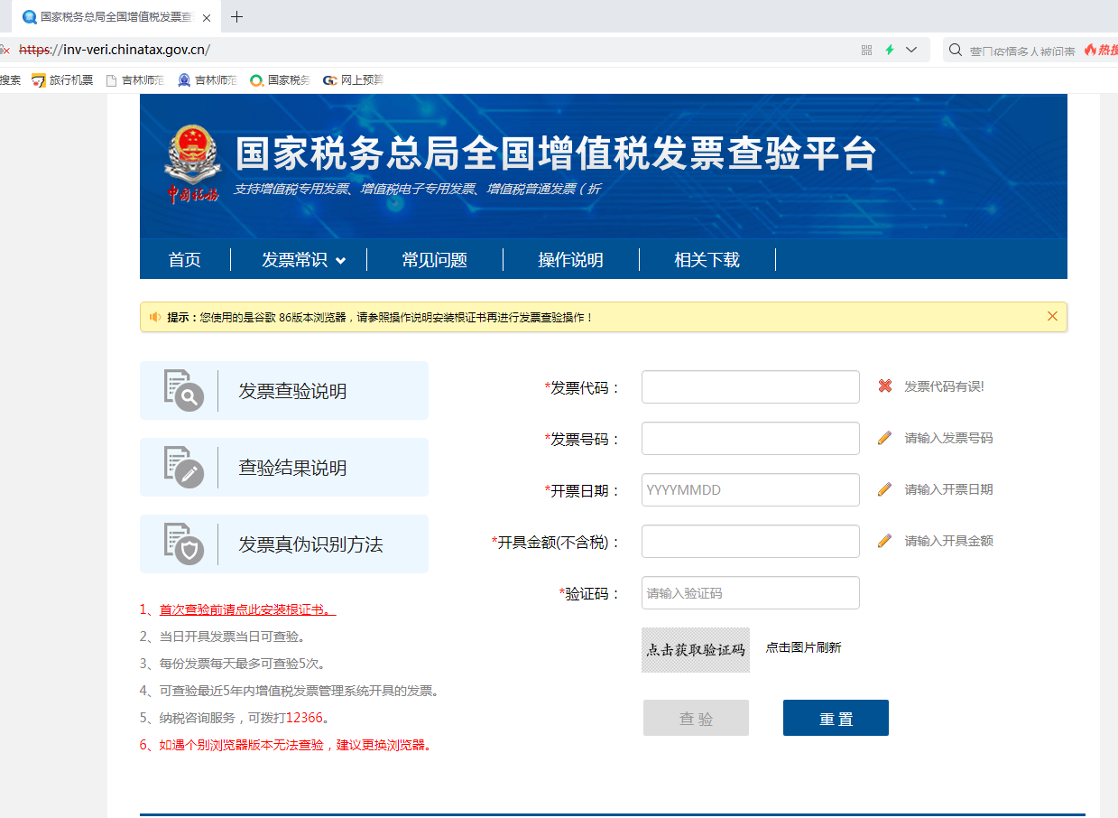 1.当事人或经办人对所取得的发票必须到“国家税务总局全国增值税发票查验平台”自行鉴别其真伪,对发票的真实性负责(吉师大校发字[2017]82号文件),并在所查发票上签字注明“已查验”,如税务等相关部门发现假发票或作废发票对学校造成影响的,项目负责人或经办人承担全部直接责任。查验网址及页面如下: