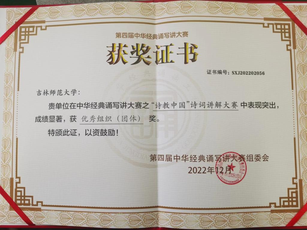 2022年12月,太阳成官网在中华经典诵写讲大赛之“诗教中国”诗词讲解大赛中表现突出,成绩显著,获优秀组织(团体)奖。
