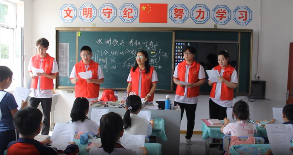 服务团成员王锐在双龙村小学带领学生们开展经典诵读水调歌头活动,引领同学们在诵读中走近中华经典。继而普及我国三大行书,带领学生们感悟汉字的独特魅力,以基础笔画、坐姿、握笔等方式为切入点来展开课程教学,整个过程寓教于乐,让孩子们养成良好写字习惯,同时大力推广书法文化。