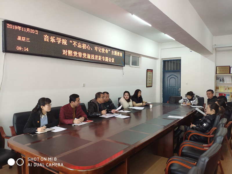 11月20日,音乐学院党总支在3楼党员活动室召开“不忘初心、牢记使命”主题教育对照党章党规找差距专题会议。校党委“不忘初心、牢记使命”主题教育领导小组第2巡回指导组成员、校团委社团部部长安桂颖到会指导,院党总支书记陈明宏主持,科处级领导干部和总支委员参加会议。