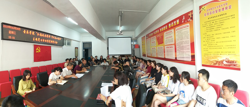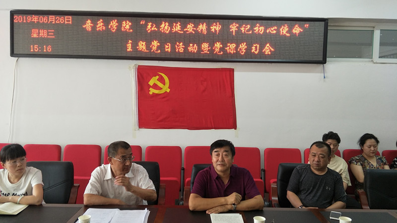 为庆祝建党98周年,2019年6月26日,音乐学院党总支在学院三楼党员活动室举办了“弘扬延安精神、牢记初心使命”主题党日活动暨党课学习会。院党总支书记陈明宏主持学习会,院关工委常委副主任赵建臣作专题报告,全院师生党员、科级干部、市政协委员、博士学位教师、学生入党积极分子参加了主题党日学习活动。