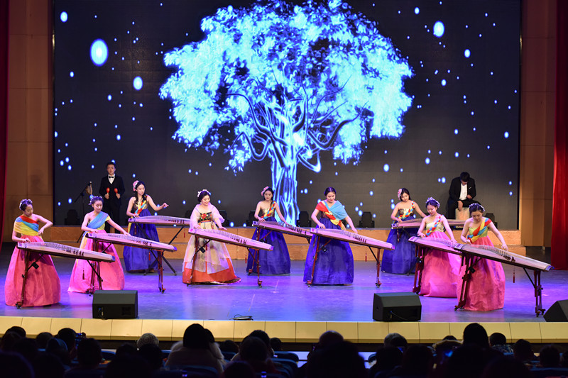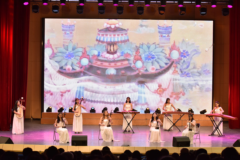 音乐会以袁丽珠老师指挥的民族乐团合奏《龙腾虎跃》开场,表现了神州大地一派欣欣向荣、龙腾虎跃的繁荣景象。王欢老师的男生独唱《节日的歌》,表达出各族群众对祖国深深的热爱和无限的自豪。青年教师孙尔年特邀沈阳音乐学院硕士研究生易圣博同学联袂演奏的古筝协奏曲《西部主题畅想曲》,惊艳新颖,具有典型的西部特色。青年教师徐潜博士的女声独唱《山歌好比春江水》,体现出浓郁的壮乡特点。青年教师张宇博士的双排键管风琴演奏电影《加勒比海盗》主题曲《he’s a pirate》,将号角般的管乐、快速的弦乐、激烈的打击乐通过一台双排键电子管风琴演奏完成,犹如一支庞大的管弦乐队,气势恢宏。青年教师张悦指导的流行歌曲合唱团演唱了《时间都去哪儿了》,具有蓬勃的生命力,朴实无华的歌词直达人心底。袁丽珠改编指导、张家睿等9位同学演奏的《盛世国乐》民乐小合奏,将东方的韵味和电声结合,音乐层次丰富、激昂、有力量,展现了民族音乐魅力。曹杨老师的女声独唱《神州共举杯》谱写出神州大地的恢弘与秀美,表达了各族人民对祖国的热爱与赞美。陈燕、于宁、潘婧、林代鑫四位老师演奏的钢琴八手联弹《军队波兰舞曲》每一个音、每一个节奏,都闪烁着生命与力量的光辉。彭丽颖博士领演的伽倻琴重奏《披头士组曲》,展现出团队的融合性和协作精神。金镇国、杨庆斌、李立平、赵晓强、张悦、王睿老师的男女声六重唱《相逢春天》,犹如一股暖流沁入听众心扉,唱出人们“新年新希望”的美好愿景,描绘了祖国正走在春光明媚大路上的日新月异。胡晓伟院长指挥、苏伯英老师等领演的管弦乐合奏《我爱你中国》最后登场,气势恢宏,场面浩大,将音乐会推向最高潮。