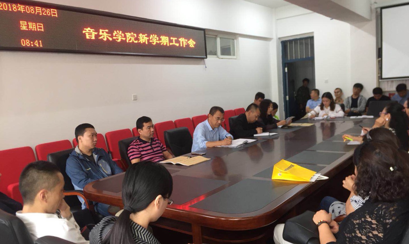 2018年8月26日上午,我院在音乐楼三楼会议室召开2018-2019学年度第一学期工作会议。院长胡晓伟主持,党总支书记陈明宏和副院长任会平、颜铁军出席,全院教职员工参加了会议。