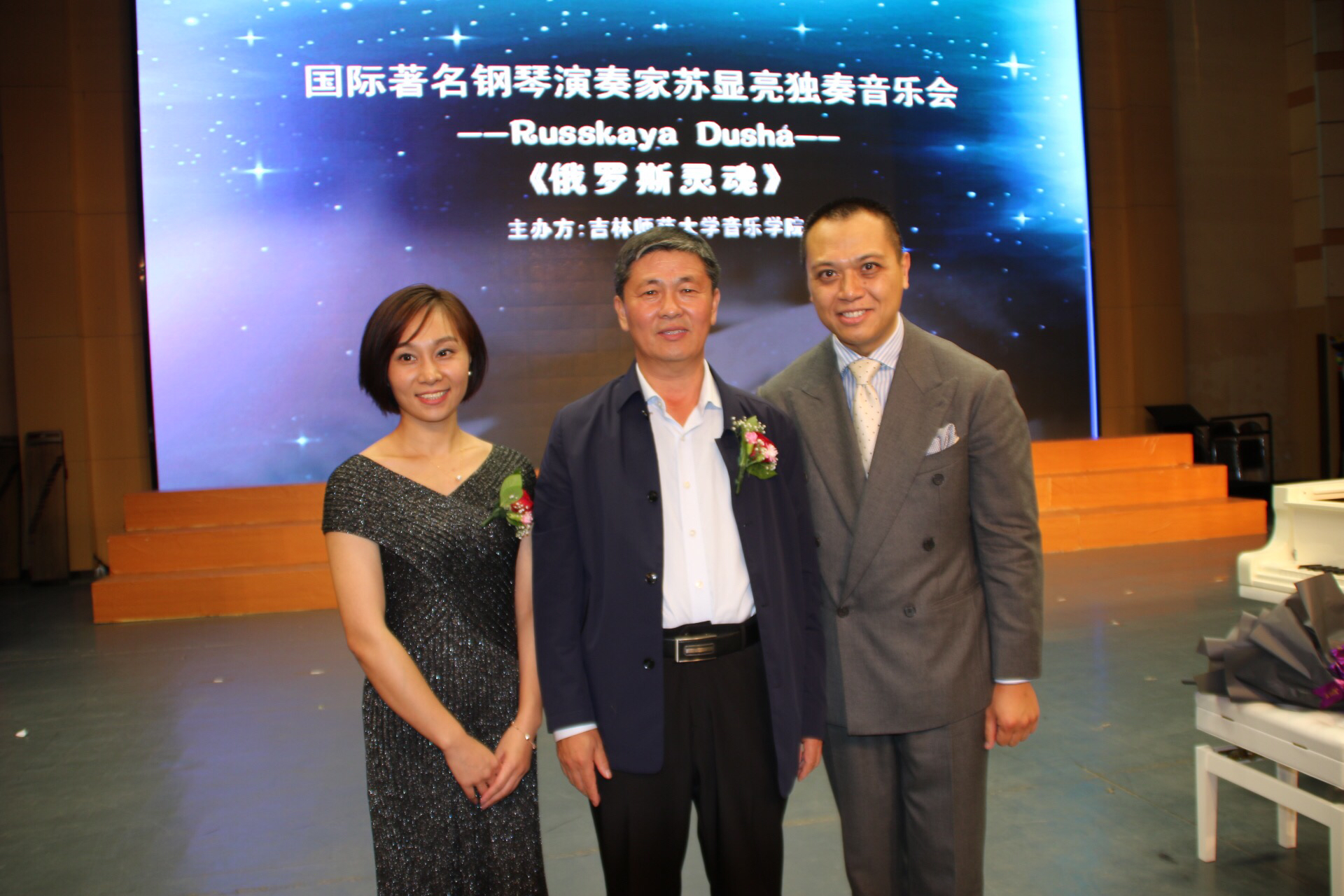 音乐会上,苏显亮教授还将自己珍藏的1941年原版钢琴曲谱和他新近出版的第六张专辑,赠送给音乐学院院长胡晓伟教授,这是音乐学院收到的最弥足珍贵的礼物。演出结束时,校长杨景海教授与苏显亮先生及领导嘉宾合影留念。