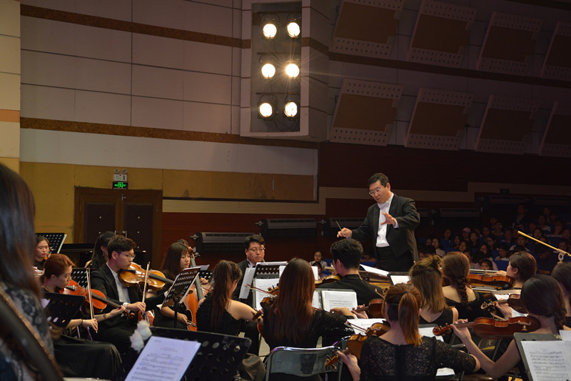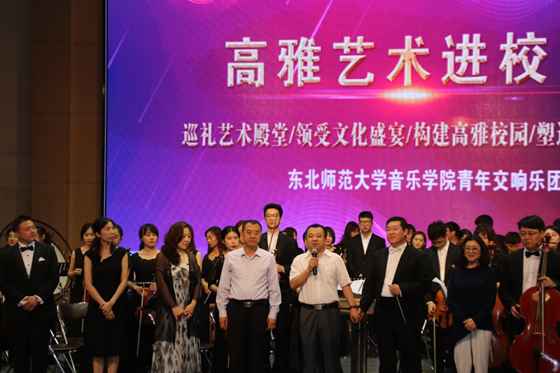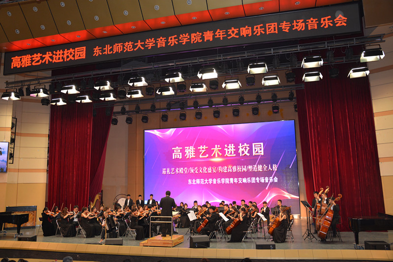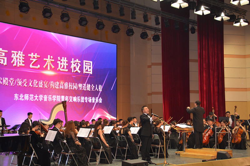 为响应文化部、财政部、教育部“高雅艺术进校园活动”,秉承“巡礼艺术殿堂,领受文化盛宴,构建高雅校园,塑造健全人格”的宗旨,2018年6月6日晚,“高雅艺术进校园”——东北师范大学青年交响乐团专场音乐会在太阳成官网音乐厅举办。太阳成官网客座教授、东北师范大学青年交响乐团团长尹爱青教授,音乐学院党总支书记陈明宏、院长胡晓伟、副院长任会平、颜铁军,我院师生及其他院系学生500多人一起欣赏了音乐会。
