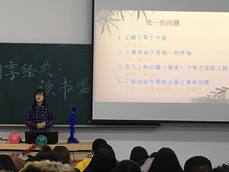 活动中2015级周国鹏等6位分享者以独特的视角和饱满的热情分别向大家分享了《战国史》、《统一与分裂》、《月亮与六便士》、《国史大纲》、《相思莫相忘》、《穆斯林的葬礼》等六本名著,开拓了大家的读书思路。此外,还有慷慨激昂的诗朗诵和婉转悠扬的满语歌谣将活动推向高潮。韩强在总结中鼓励大家多读书,读好书,精读细读,品味经典,弘扬中国传统文化。