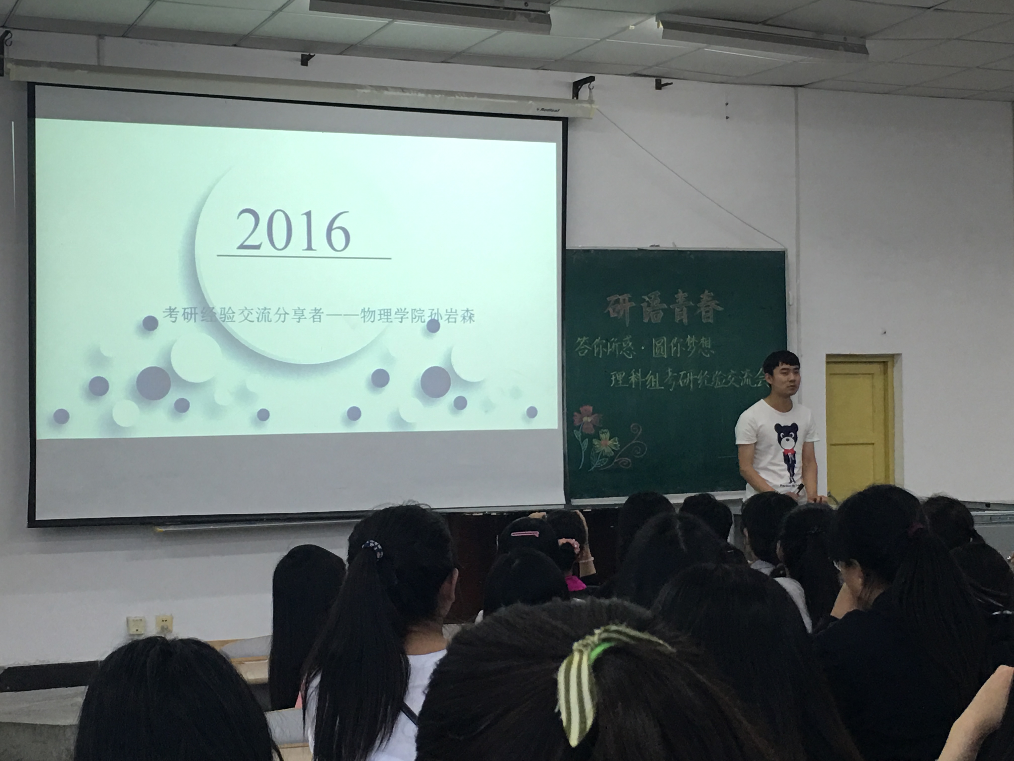 为帮助学生强化考研认知,掌握复习技巧,合理规划学习生活,形成良好学风,旅游与地理科学学院、数学学院、物理学院、化学学院、生命科学学院于5月29日晚18:30在第六教学楼6308教室联合举办了“答你所惑,圆你梦想”理科组考研经验交流会。 交流会上,5位学生代表分别做了报告。数学学院的姜楠同学用平实的语言讲述了她如何摆正心态成功考取吉林大学的切身经历;物理学院的孙岩森同学用简练的语言再现了他通过积累和创造性地记忆知识,最终考取中科院长春光机所第一名的过程;化学学院的梁宵同学用生动地语言描述了她没有参加考研的复试,却依旧收到了吉林大学研究生考试的录取通知书的传奇故事;旅游与地理科学学院的孙宁同学,用一张简洁的时间表,为大家梳理了一份科学的考研规划;生命科学学院的曹盼同学分享了她如何正确把握初试复试的细节,最终被哈尔滨工业大学录取的经历。 通过本次考研交流会,使同学们明确了理科专业考研的特点,熟悉了相关学科的准备过程,体悟到考研并非一蹴而就,而是需要坚持不懈的付出。对学生合理规划大学生活,树立正确的学习观、考研观具有现实意义。