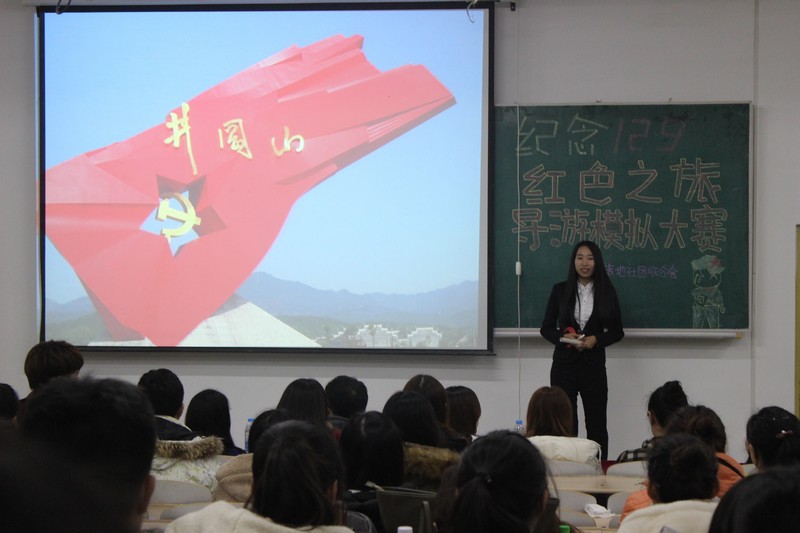 2015年12月9日,旅地学院举办学工品牌活动--红色之旅暨一二.九运动八十周年导游模拟大赛。本次大赛邀请了旅游管理专业老师甘竞老师,学工办代牧老师和范妙然老师。大赛分为三个环节,第一环节导游词讲解,第二环节才艺展示,第三环节知识问答。