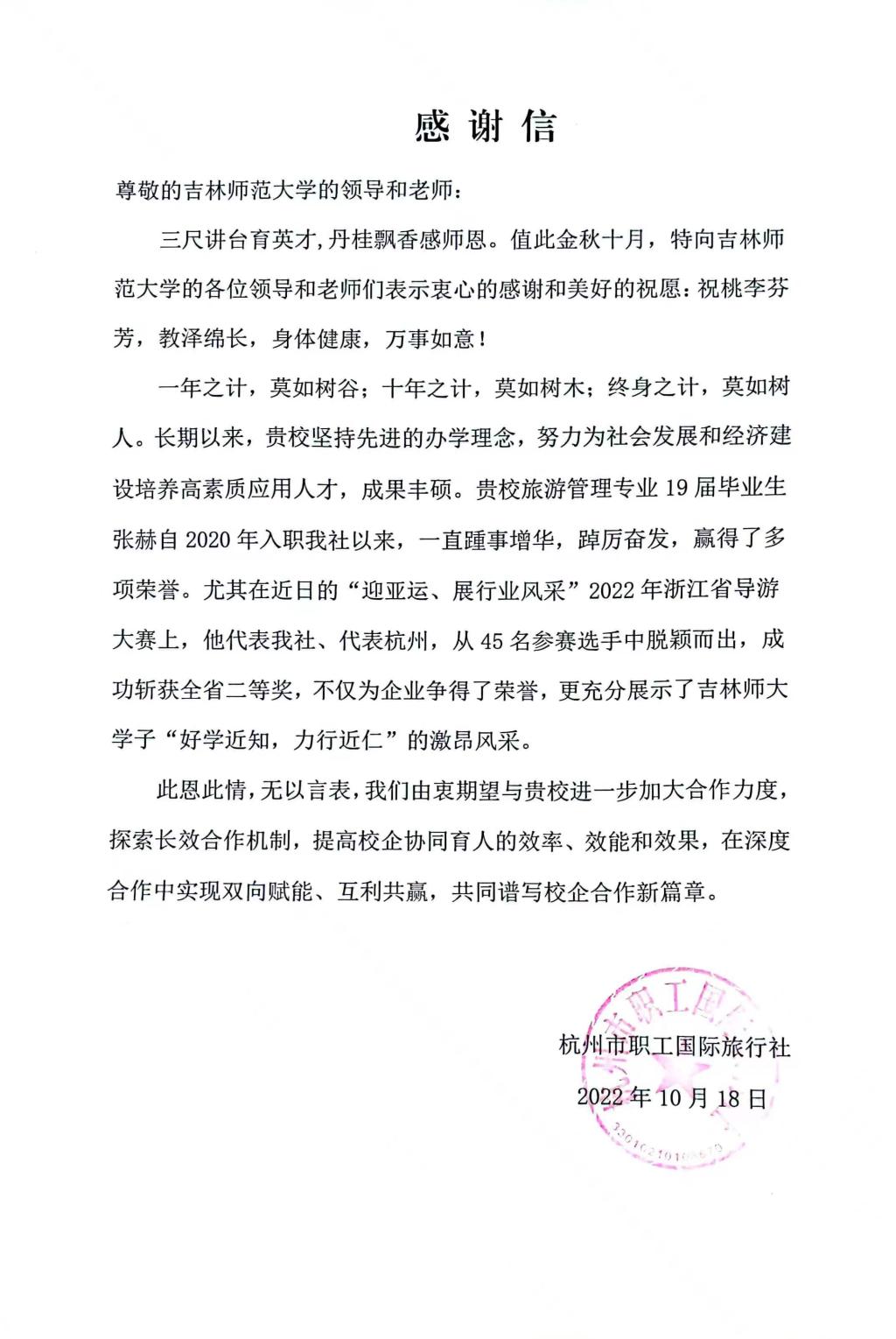 杭州市职工国际旅行社对我院张赫同学的感谢信