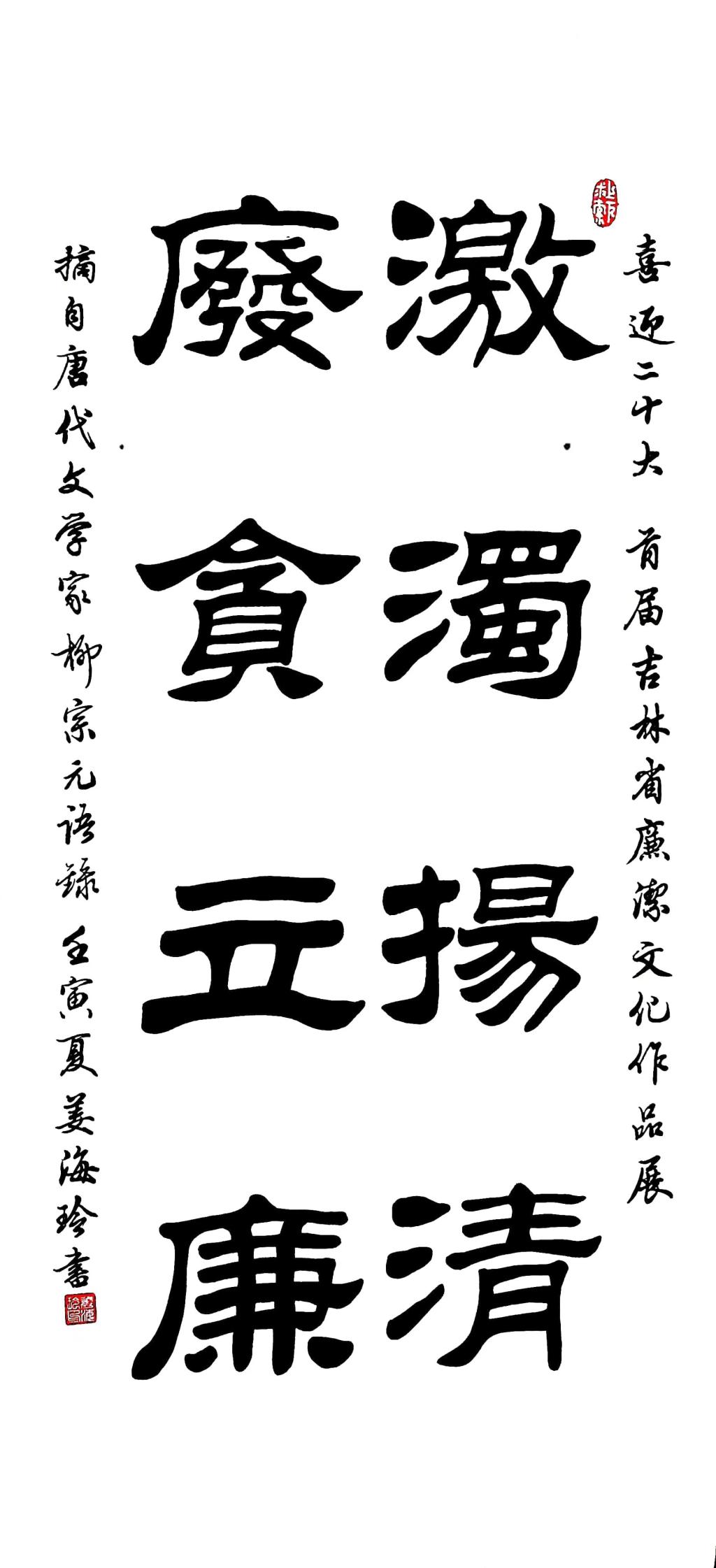 姜海玲老师的书法作品《激浊扬清·废贪立廉》荣获个人“特等奖”