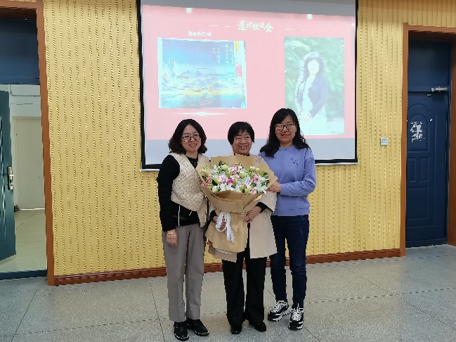随后,院党委书记冷传平和学院工会主席甘静为邵兰霞老师送上鲜花和纪念品。