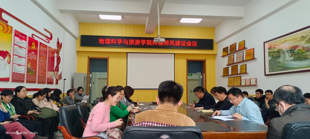 师德是教师之根;师风是教育之魂。为加强学校师德师风建设,引导全体教师切实学习践行新时代师德规范,2月22日下午,地理科学与旅游学院在第六教学楼三楼会议室组织召开了师德师风专题工作会议。学院院长刘吉平、党委书记冷传平、党委副书记张海鹏、副院长孙滢悦及全体教职工参加会议,会议由党委书记冷传平主持。