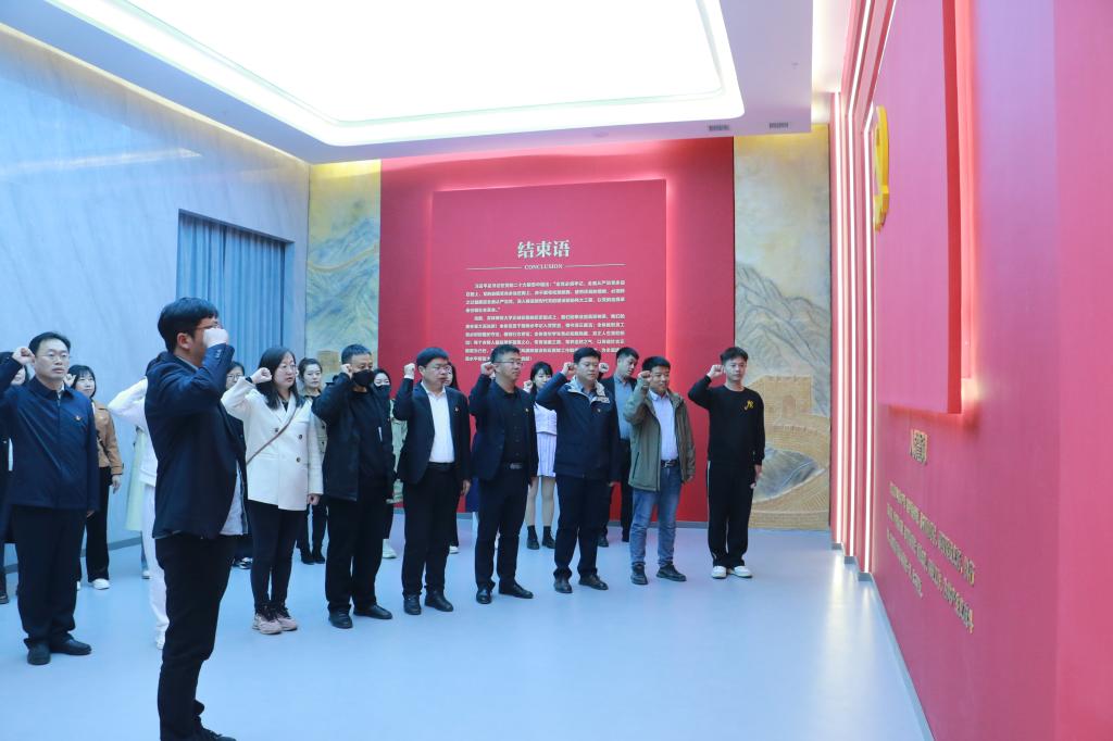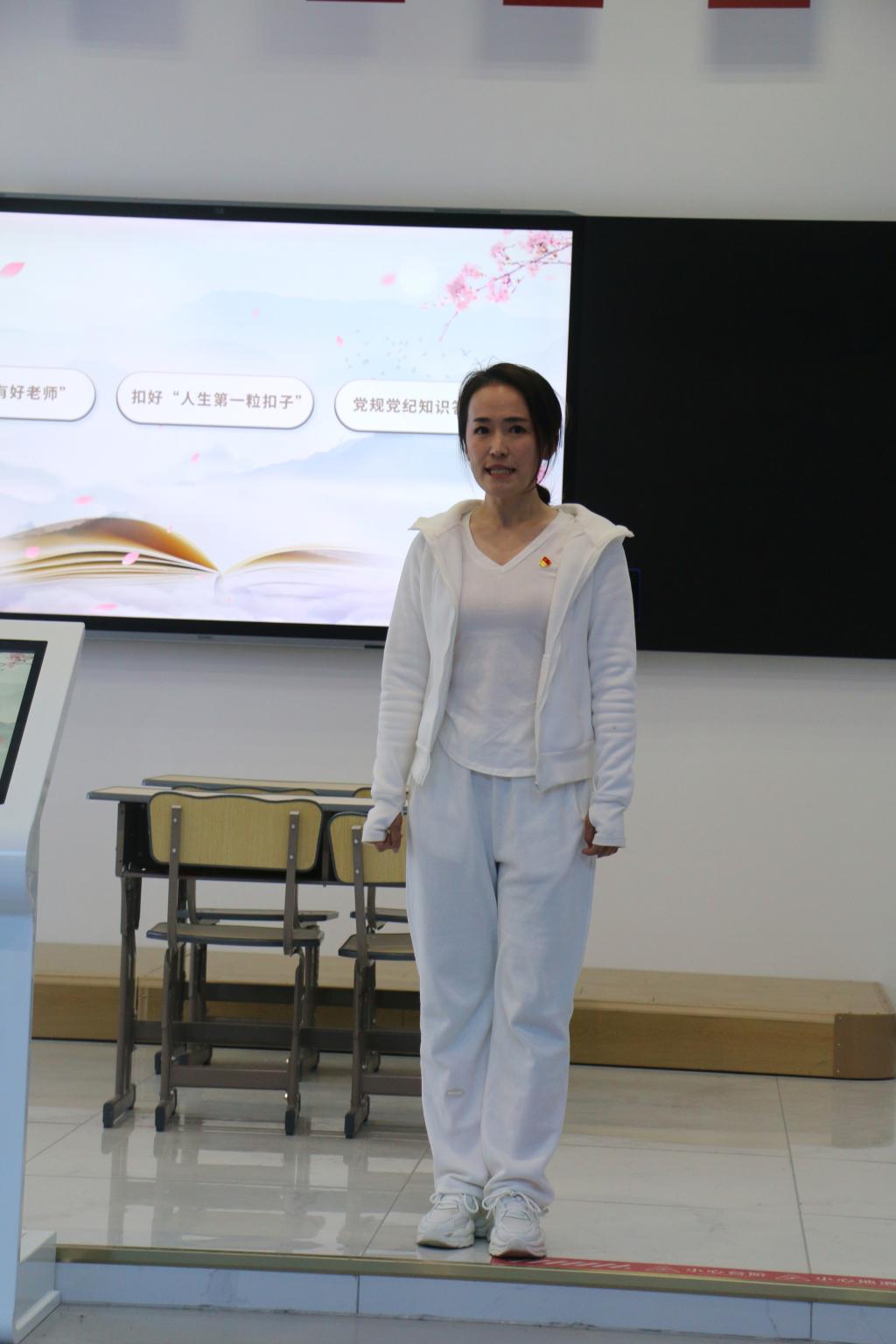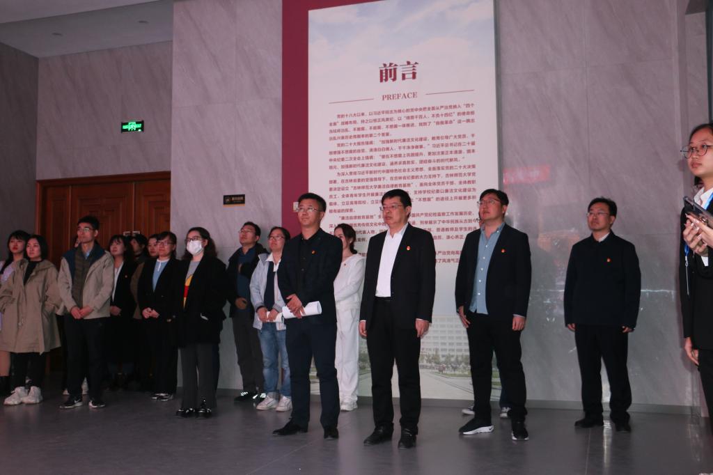 在基地前言部分,教师们参观了多种字体构成的“百廉图”,并观看了主题宣传片《廉洁自律,好学力行》。在基地主展厅部分,首先参观了第一篇章“敬·铸魂立心”,学习了解党的百年纪律建设史;然后是第二篇章“净·德行润心”,深刻体会中华廉政文化与中华文明史同在;接下来第三篇“镜·歧路警心”,以案明纪,时刻敲响心中纪律的警钟;第四篇“境·吉师涤心”,激励每一位教职员工脚踏实地,认真履职尽责。作为主展厅最后一篇,讲解员从多角度介绍了学校党委对党风廉政建设工作的高度重视,并引导各位老师到智慧体验教室,通过视频学习去思考如何成为一名“四有”好老师。在受教者的演讲平台,教师第三党支部书记姜海玲作为教师代表在智慧教室分享了个人学习心得。最后,在基地尾厅的宣誓区,全体教师面向党旗,庄严肃穆地重温了入党誓词。