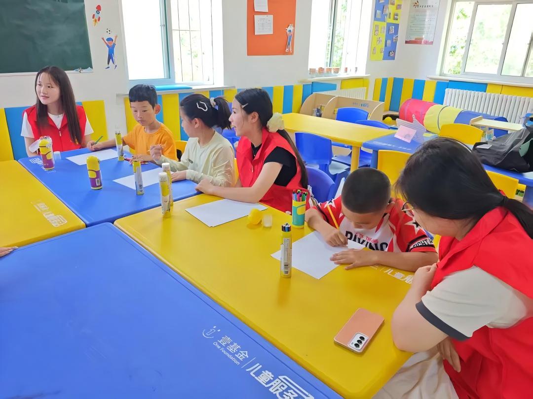 最后,进入“画麦穗”环节。在志愿者的耐心指导下,孩子们聚精会神地伏在画纸上,用稚嫩的笔触勾勒心中的金黄麦穗。尽管笔触天马行空,但孩子们的天真想象让丰收图景与童真创意在色彩中交融,绘就了一幅幅充满童趣的芒种画卷。