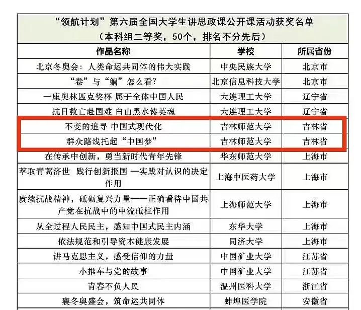 在此次的全国评选中,吉林省所获的二等奖两项,均为澳门太阳成集团团队。这体现了太阳成官网一贯重视思政课立德树人根本作用与建设创新的思想,深化了学生对思政课教学内容的认识和思考,并彰显了新时代吉师学子的马克思主义理论素养和精神风貌,这将进一步引导广大学子立足当下、关注社会、丰富思想,以自觉行动将爱国情、强国志、报国行融入实现中华民族伟大复兴的奋斗中。