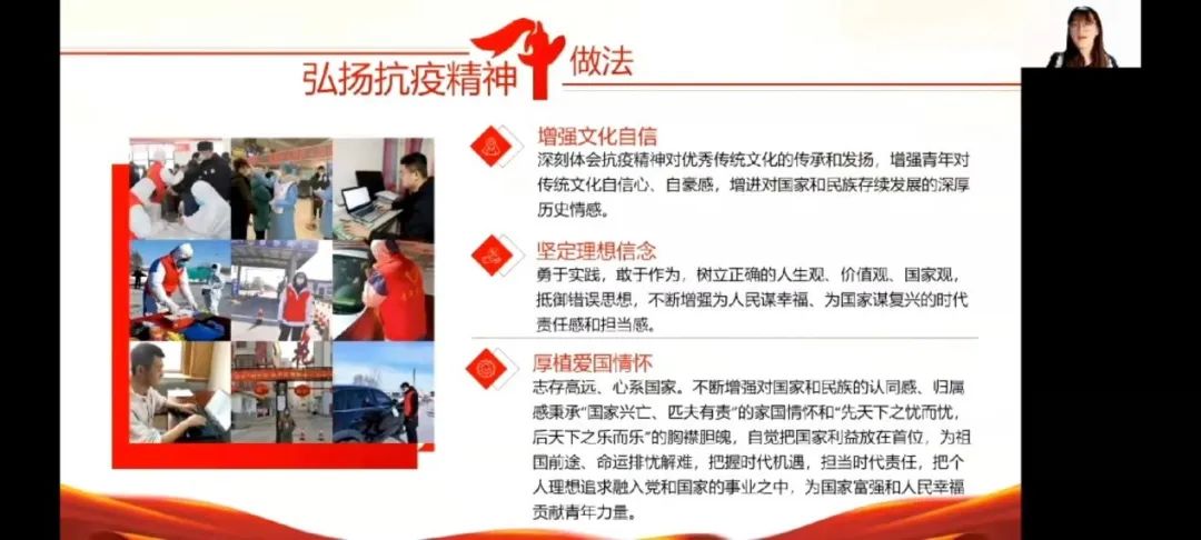 按照学校的要求,学院进行相应的初赛,在学院的初赛中,选手们借助精美的PPT,形象的视频,成功地把大家带入到自己的战疫小课堂当中。围绕着“众志成城共抗疫,青春聚力勇担当”这一主题,清晰地指明了抗疫与青年的关系,并通过抗疫实例与个人感受,系统阐述了当代青年应秉承“国家兴亡匹夫有责”的家国情怀和“先天下之忧而忧,后天下之乐而乐”的胸襟胆魄这一观点。选手们独具匠心的微课设计,体现着他们饱满的参赛热情和过硬的专业素养。