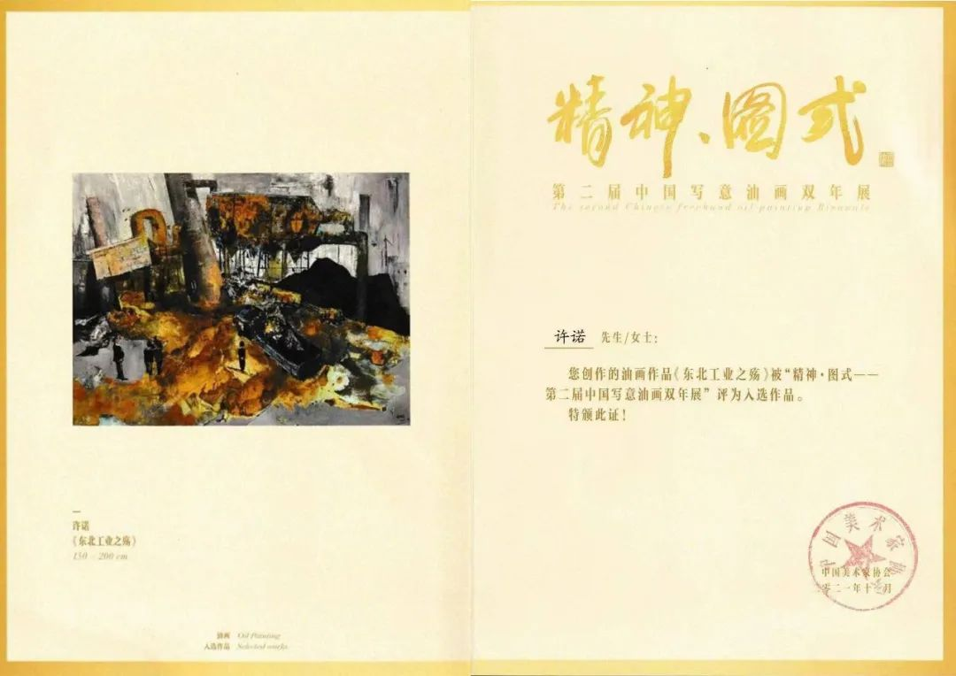 2021年11月,许诺老师的油画作品《东北工业之觞》入选中国美术家协会主办的“精神·图式——第二届中国写意油画双年展”。