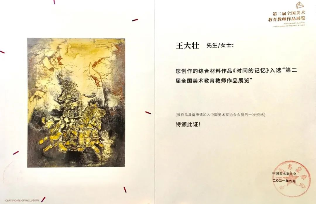 2021年9月,王大壮老师的综合材料作品《时间的记忆》获中国美术家协会主办的第二届全国美术教育教师作品展入会资格(展览最高奖项)。