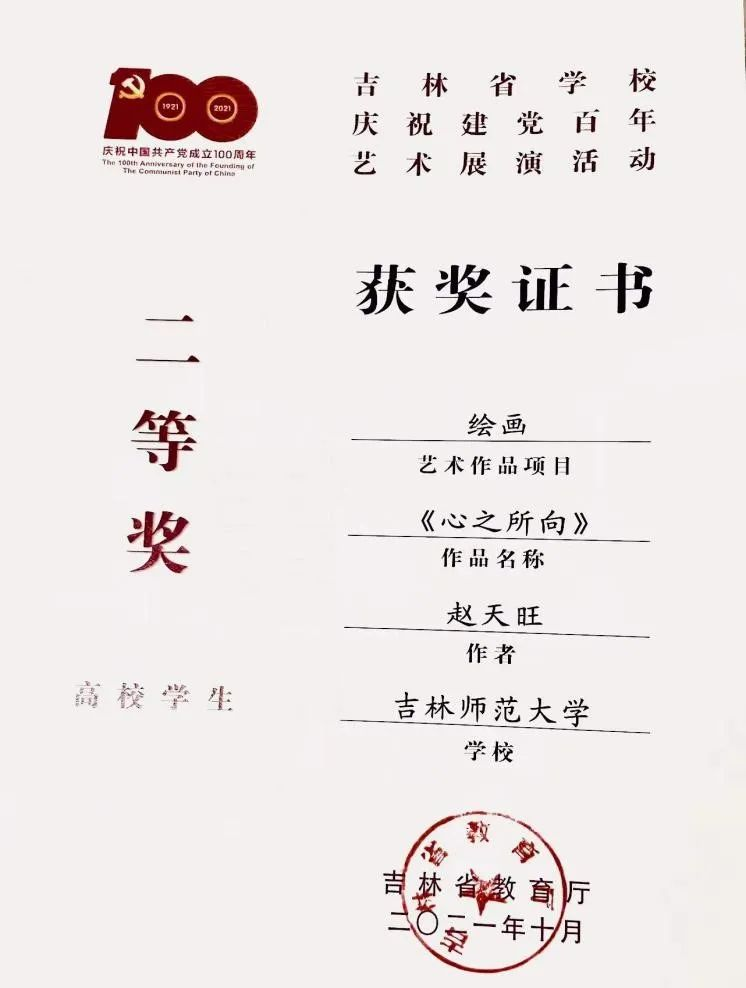 2019级研究生李欢、2018级绘画专业赵天旺同学在吉林省学校庆祝建党百年艺术展演活动中获二等奖。