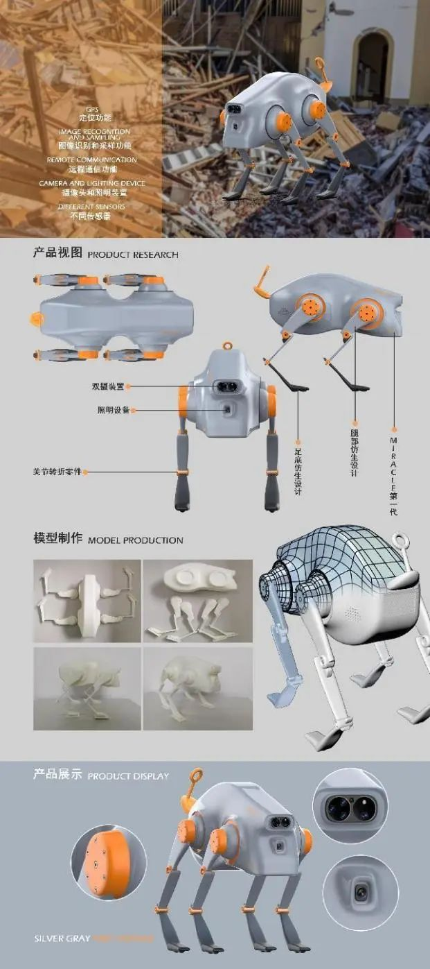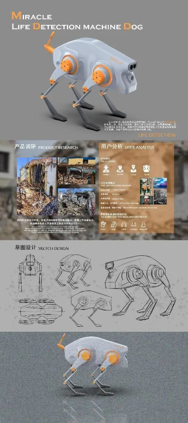 Miracle——生命探测机器狗可自行在复杂的灾后地形情况下进行生命体搜救,探测到生命体征时能够通过GPS定位系统向终端设备发送生命体信息。通过机器狗的外观仿真设计、超宽谱雷达技术、定位功能、图像识别和采样功能、远程通信功能和摄像头及照明装置的配合共同创造智能化自动化机器狗,是未来机器狗应用发展的新方向之一。