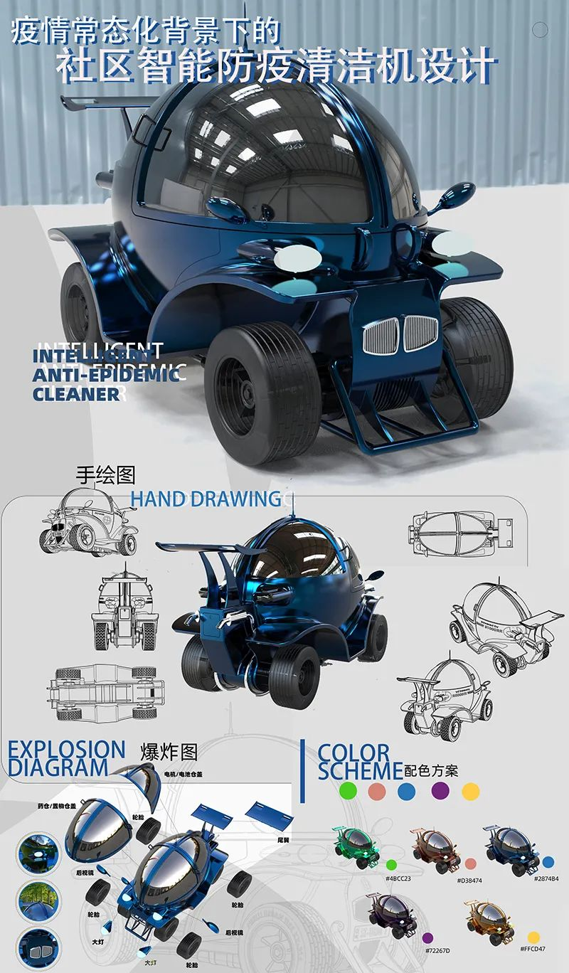 该设计方案适用于喷洒液体和粉末状的消毒产品,其车头处设有储存仓,可代替医护人员减少不必要的接触;与此同时,也同样适用于社区服务以及外卖、快递等无接触式配送工作,降低疫情期间人员接触带来的安全隐患。