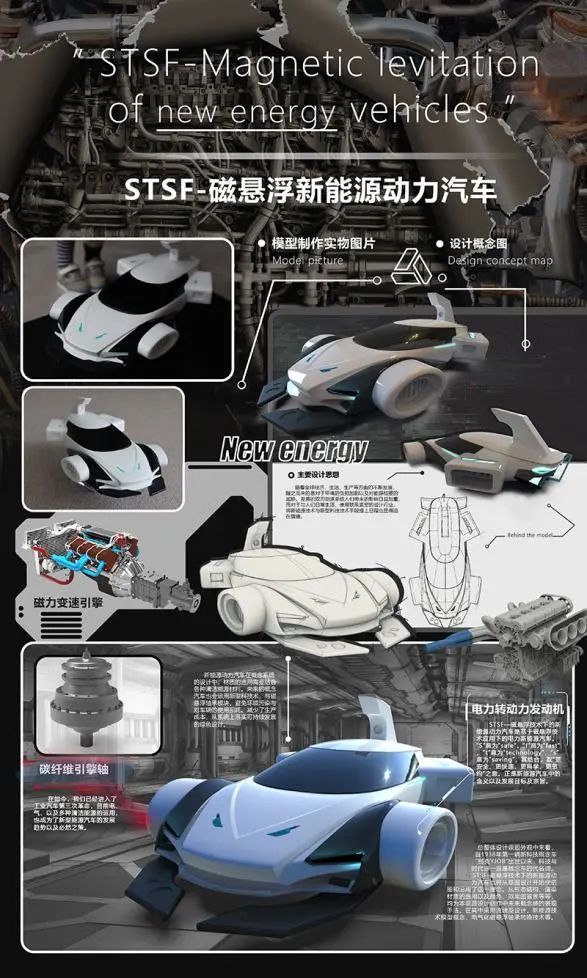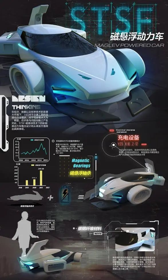 “S”意为“safe”,“f”意为“fast”,“t”意为“technology”,“s”意为“saving”,其结合,取“更安全、更快速、更科学、更节约”之意。本次设计将电气新能源、磁悬浮技术、与概念外观相结合,使磁悬浮技术下的新能源动力汽车更具象化。