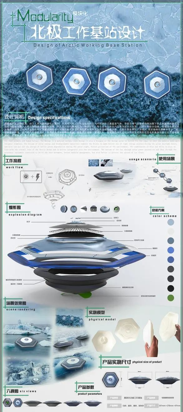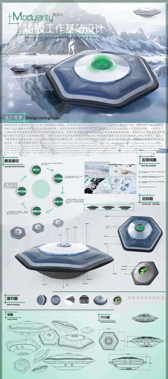 本次设计针对北极熊、海狮等需要海冰停靠栖息、研究科研人员驻扎生存问题、海船停泊休息补充能源基站等问题进行优化思考,既预防北冰洋海冰融化后濒危动物的灭绝,又可为科研人员提供科考庇护,是对陆地生物生存容纳问题的积极解决。