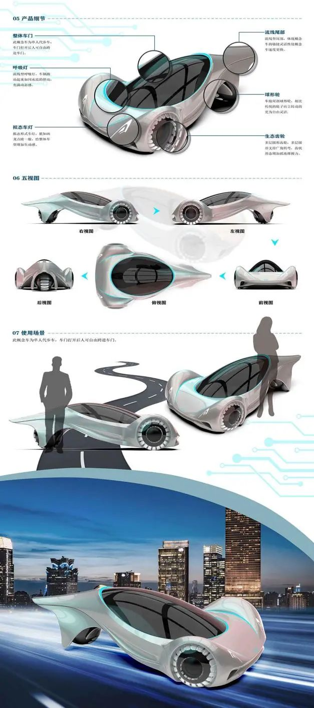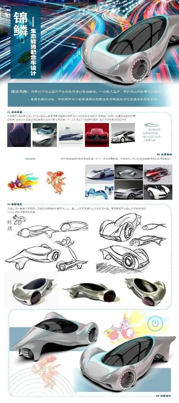 一款概念电动车,造型简约流畅把中国吉祥元素,鱼,云纹等跟别的元素结合在一起,使汽车在与中国元素结合的同时,更加具有科技感与未来感。