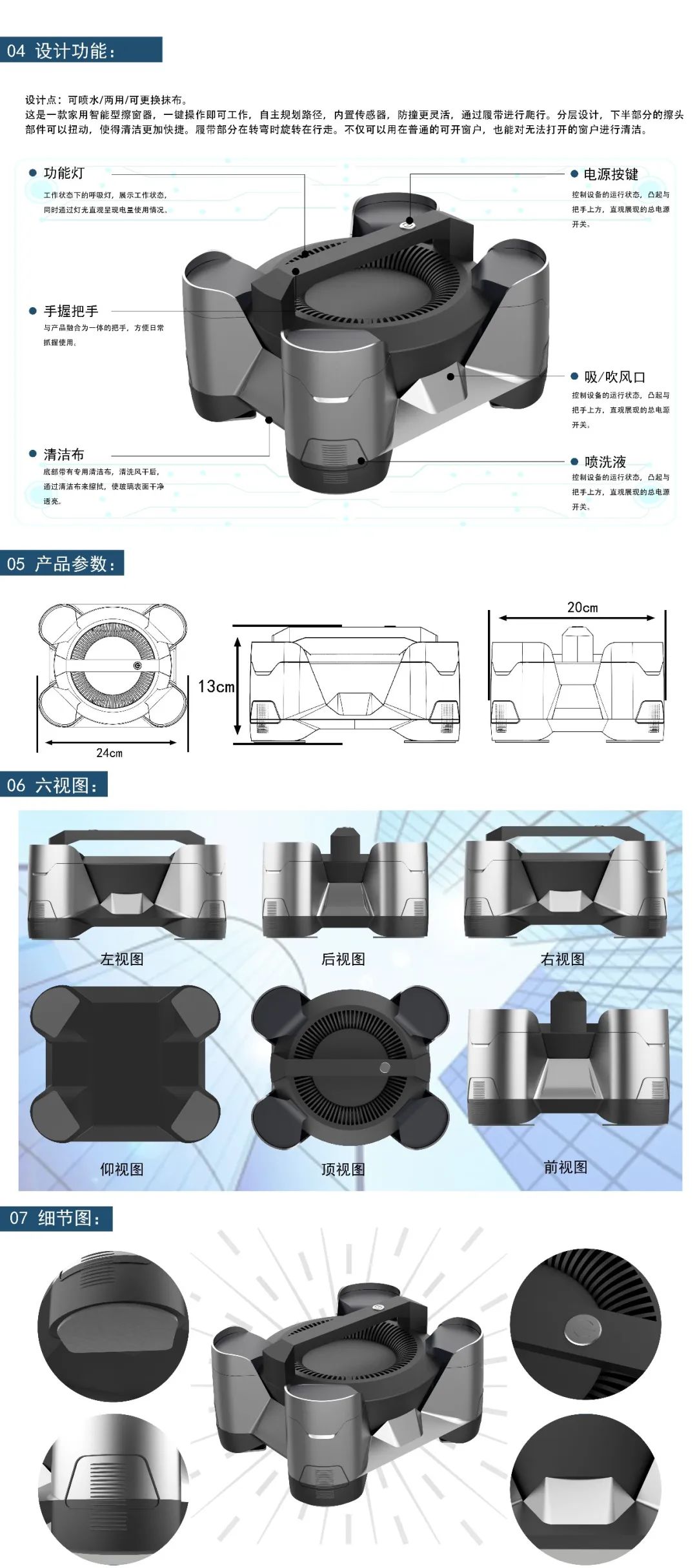 本产品结合了智能化,现代化的交互设计,一键操作即可工作,自主规划路径,内置传感器,防撞更灵活。分层设计,下半部分的擦头部件可以扭动,使得清洁更加快捷。爬行履带部分在转弯时旋转调节行走轨迹。可对摩天大楼等进行内外清洁。